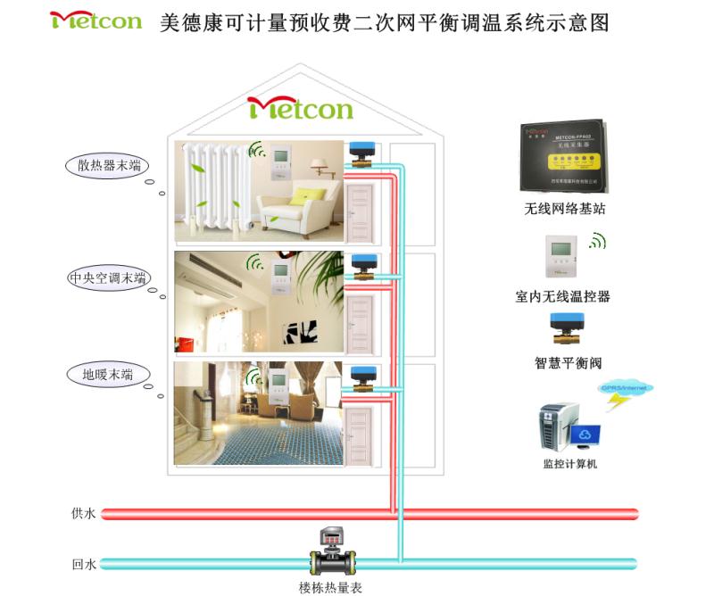 智慧平衡阀,无线室温控制器(选配),中继器、集中器与远程服务器。